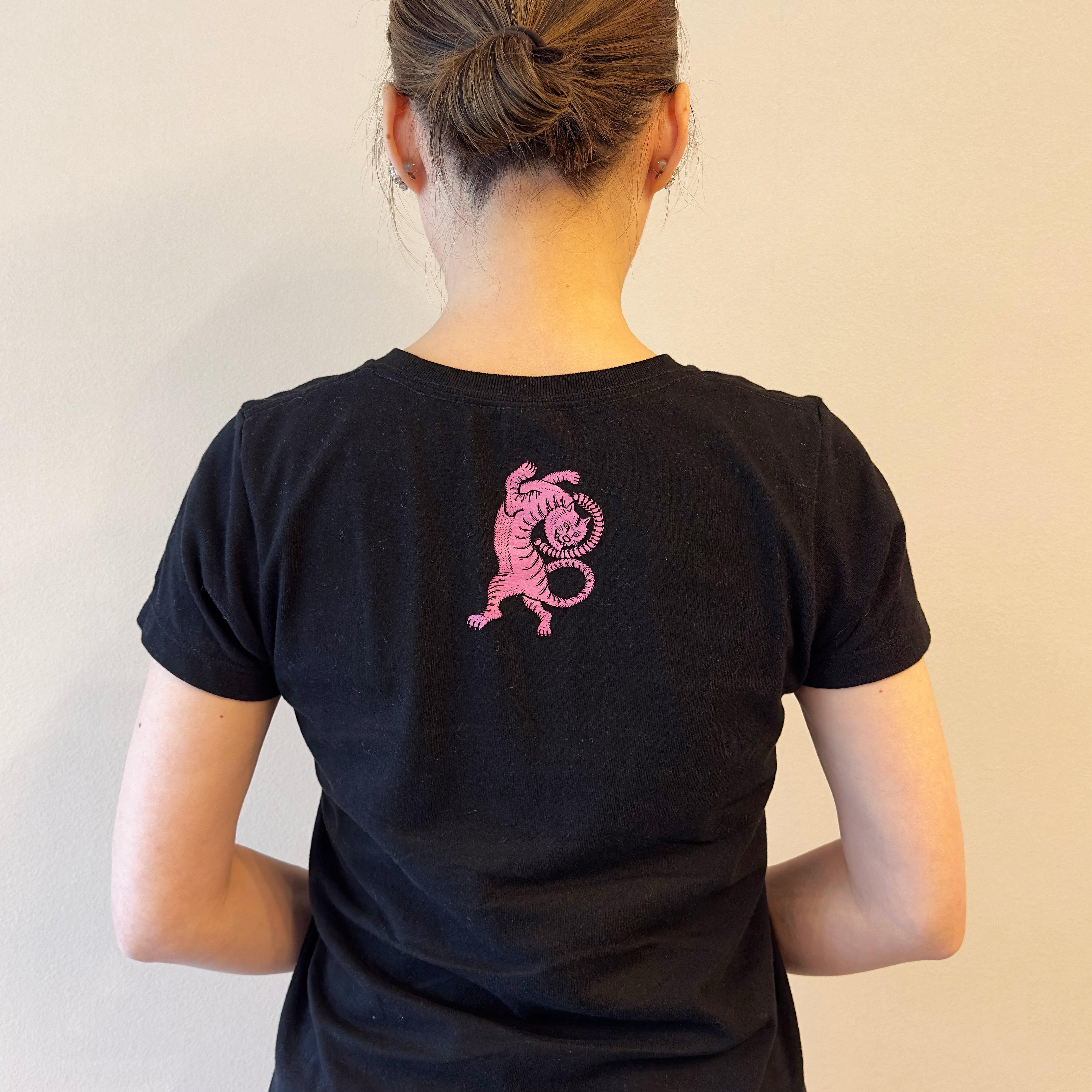 Tシャツ 4.5onz 白/黒 サイズ レディース XS,M,L メンズ M,L ピンクシルク印刷 前面 オリジナルロゴマーク 背面 オリジナルイラスト